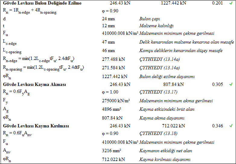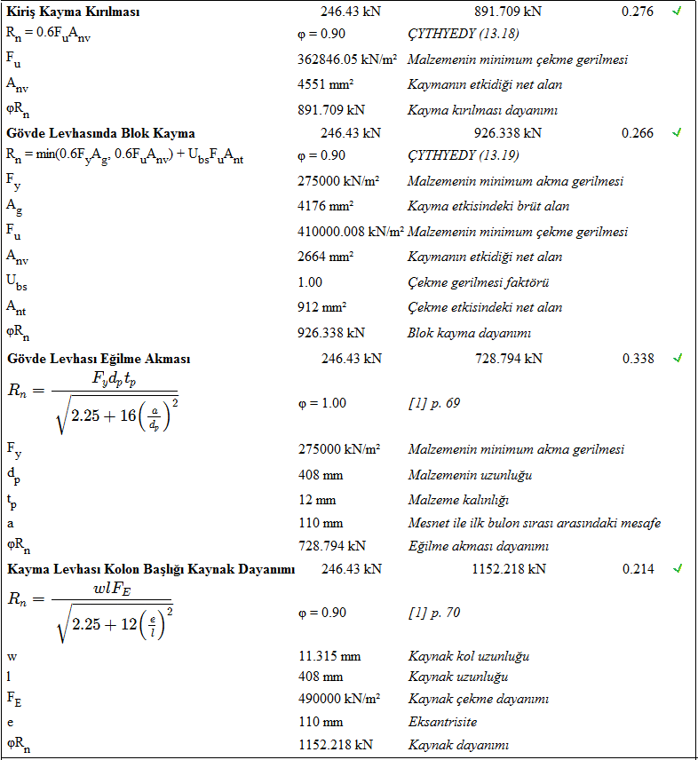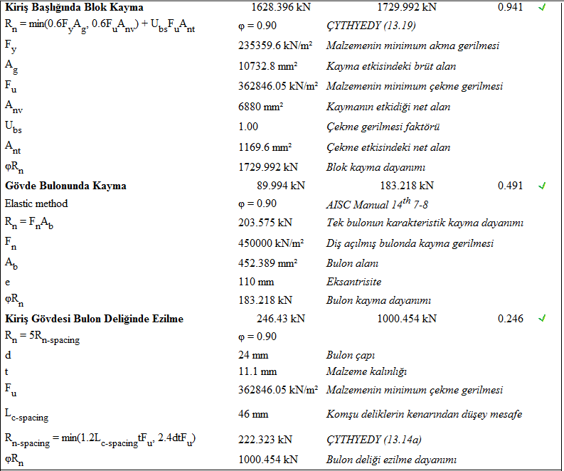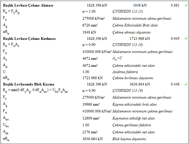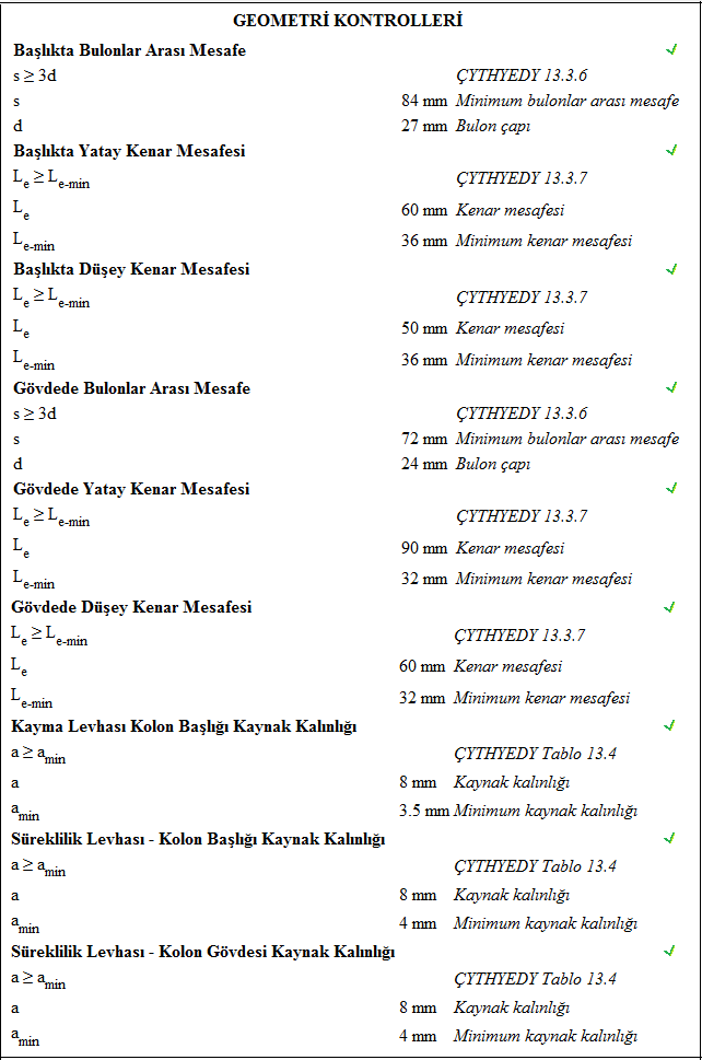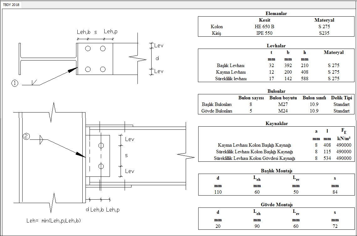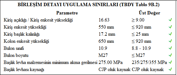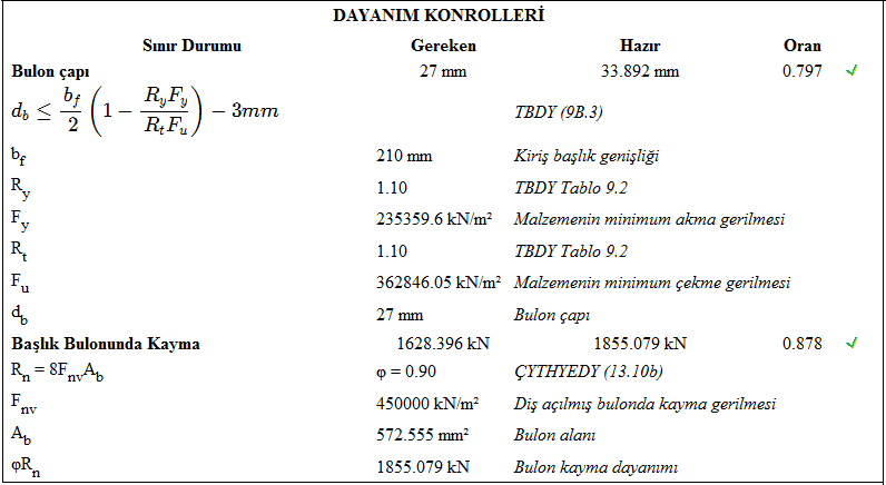 Başlık levhalı bulonlu birleşim tasarımı Çelik Yapıların Tasarım, Hesap ve Yapım Esasları (ÇYTHYEDY), AISC 360-16, AISC 358-16 ve TBDY yönetmeliklerine göre otomatik yapılır ve birleşim raporu oluşturulur.