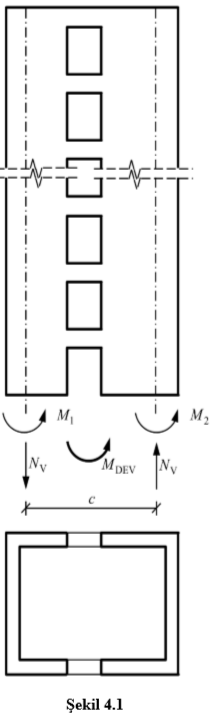 Burada MDEV bağ kirişli (boşluklu) perdenin tabanındaki toplam devrilme momentini, M1 ve M2 bağ kirişli perdeyi oluşturan perde parçalarında deprem etkisinden tabanda elde edilen eğilme momentlerini, NV ise deprem etkisinde bağ kirişlerinde oluşan kesme kuvvetlerinin tüm perde yüksekliği boyunca toplamı olarak, perde parçalarının tabanında oluşan birbirine eşit çekme ve basınç eksenel kuvvetlerine karşı gelmektedir. C, perde parçalarının enkesit ağırlık merkezleri arasındaki uzaklığı göstermektedir (Şekil 4.1). Denk.(4.13)’ten elde edilen büyüklük 4.3.4.5 ve 4.3.4.6’da perde taban devrilme momenti MDEV olarak kullanılacaktır.