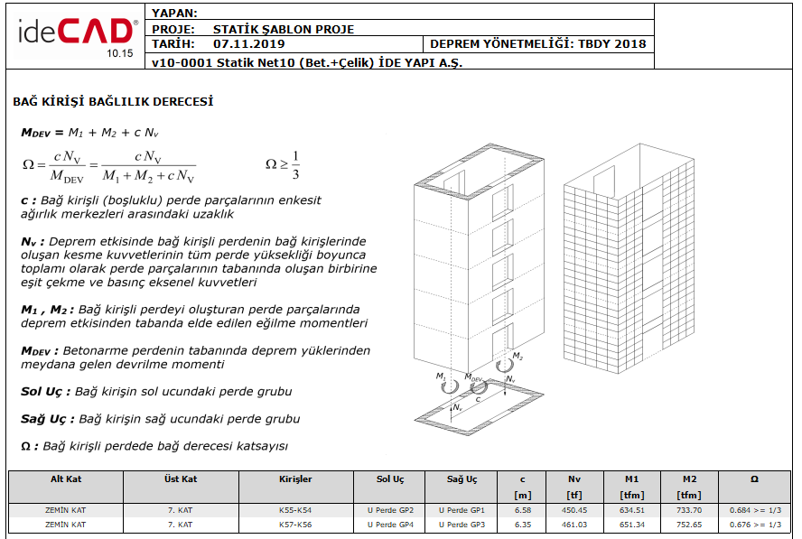 4.5.4.4 gereği bağ derecesi katsayısı ve bağ kirişli perde tanımlarına uygun olup olmadıkları Denklem 4.13 , 4.14 ve 4.15 ile otomatik hesaplanır ve gereken durumlarda uyarı verilir.