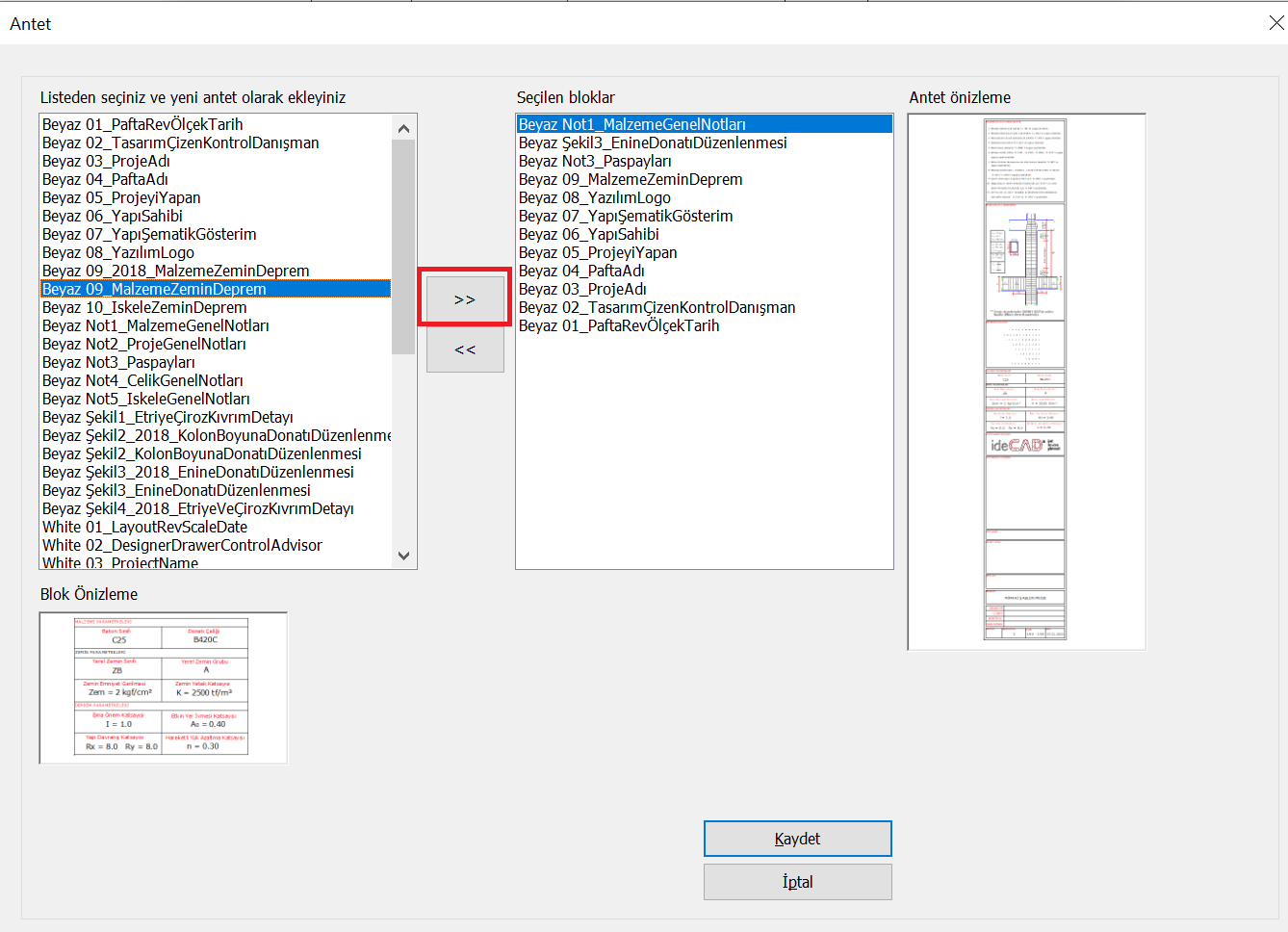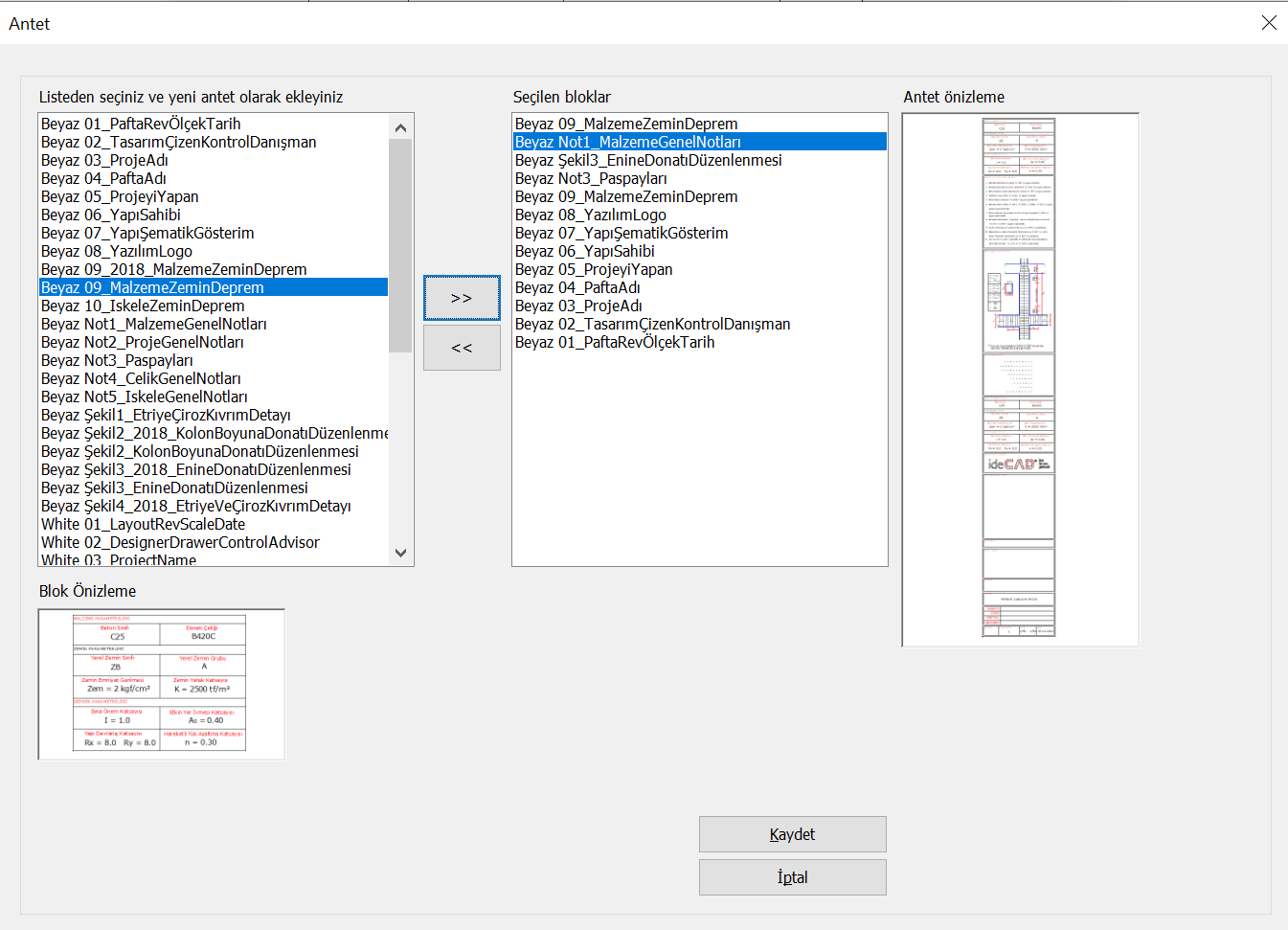 Blok Önizlemesinde gösterilen Malzeme Zemin Deprem bloğu antete eklenecektir.