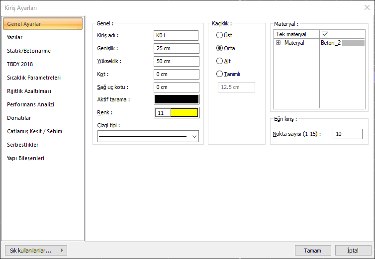 Kiriş Adı ![]() Kiriş numarası görünür ve değiştirilebilir. Kiriş oluşturulduğunda burada yazan isim görünür ve her yeni kirişte numara bir artar. K01, K02, K03 vb. |