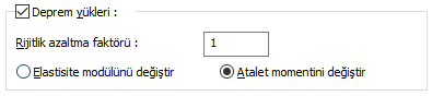 ![]() Kolon rijitllikleri, deprem, düşey, rüzgar ve toprak itkisi yüklemeleri için ayrı ayrı belirli bir çapan değeriyle azaltılabilir. Rijitlik azaltması, eleman elastisite modülü ya da atalet momenti bazında seçenekli olarak uygulanabilir. E = AzaltmaFaktörü *E veya I = AzaltmaFaktörü * I olarak uygulanır. |