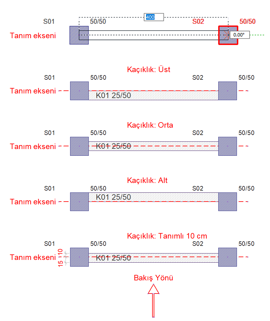 Kaçıklık ![]() Kirişin nereden tanımlı olacağını belirleyen seçeneklerdir. Kirişin iki ucundaki düğüm noktalarını birleştiren sanal kiriş aksı, bakış yönüne göre kirişin üst kenarı ile çakışacaksa üst, alt kenarı ile çakışacaksa alt, kirişin tam ortasından geçecekse orta seçeneği işaretlenir. Sanal kiriş aksı başka bir hattan geçecekse Tanımlı seçeneği işaretlenir ve alttaki veri giriş kutucuğuna, kiriş üst kenarına göre mesafe girilir. Verilen mesafe kiriş kalınlığından fazla olmamalıdır. Üst, alt ve orta kaçıklık değerleri veri girişi esnasında kiriş ilk düğüm noktası belirlendikten sonra klavyeden space tuşuna basarakta ayarlanabilir. ![]() |