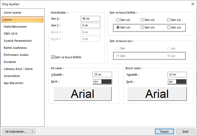 İsim X/ İsim Y ![]() Kiriş Adı yazısının kiriş sol üst köşesine göre X ve Y koordinatları girilir. Yazı X değeri pozitif girilirse isim yazısı sola, negatif olursa sağa kayar. Yazı Y değeri pozitif olursa isim yazısı yukarıya, negatif olursa aşağıya kayar. |