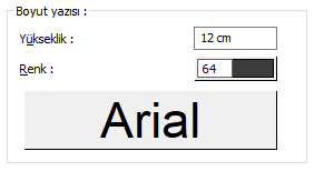 Boyut Yazısı Yükseklik, Renk ve Yazı tipi ![]() Kiriş boyut yazısının yüksekliği girilir. Renk kutusu farenin sol tuşu tıklanıp açılan renk paletinden seçilir. Hemen alttaki buton tıklanırsa, Yazı Tipi Ayarları diyalogu açılır. Bu diyalogdan Kiriş Boyut Yazısı, yazı tipi ayarlanır. |