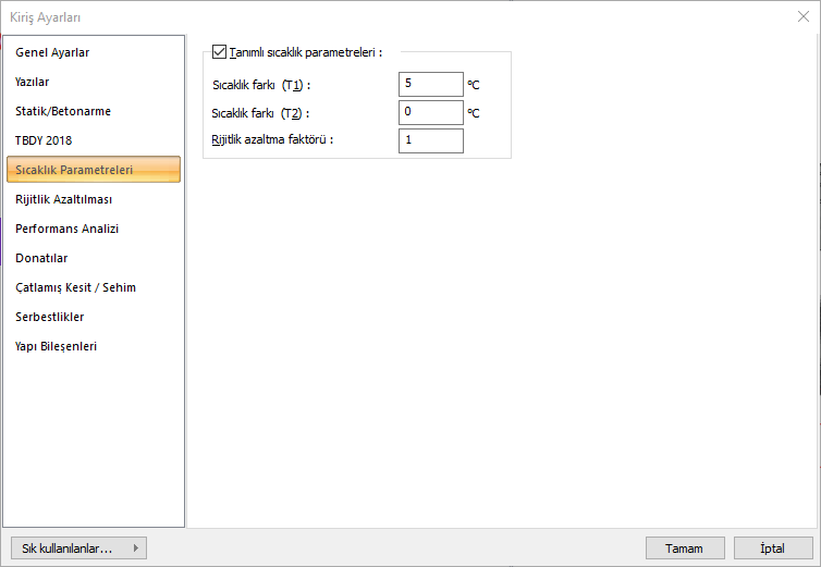 Tanımlı sıcaklık parametreleri ![]() İşaretlendiğinde eleman bazında T1 ve T2 sıcaklık yüklemelerini aktif hale getirir. |