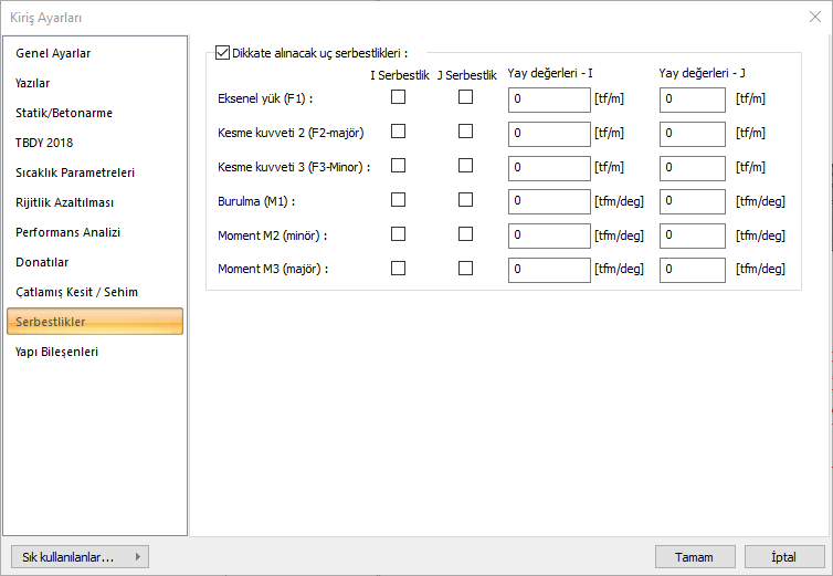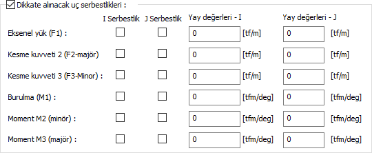 Dikkate alınacak uç serbestlikler ![]() Bu sekme, sadece kirişler seçilip Obje Özellikleri ile ayarları çağrıldığında görünür. Kiriş sol ve sağ uçlarındaki serbestlik/ankastrelik durumunu değiştirmek için kullanılabilir. Yönetmeliğe uygun tasarım için normal durumlarda müdahale etme gereği olmayan bu parametrelere, gereksinim duyduğunuzda ilgili yöndeki seçeneği işaretleyerek değiştirebilirsiniz. i, elemanın sol ucu, j elemanın sağ ucudur. Yay değeri büyüdükçe ilgili uç daha az deplasman yapacaktır. Değiştirmek isteğiniz parametrenin uygun eksendeki değerlerine müdahale edebilirisiniz. |