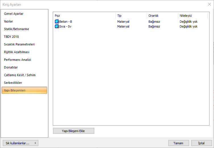 Yapı Bileşenleri Ekle: Detaylı yapı bileşenleri metrajı için tanımlanan yapı malzemelerini objeye atar.
