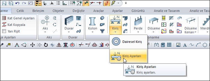 Kiriş Ayarları komutuyla betonarme kirişin boyut, çizim, yerleşim, materyal seçimi, statik malzeme gibi ayarlarına ulaşılır.