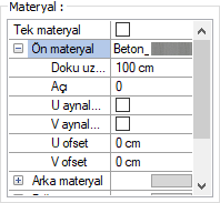 Materyal ![]() Kirişin yüzeylerinde kullanılacak materyal listeden seçilir. Yüzeyler seçilen materyal ile kaplanır ve renderlarda bu şekilde görüntülenir. |
