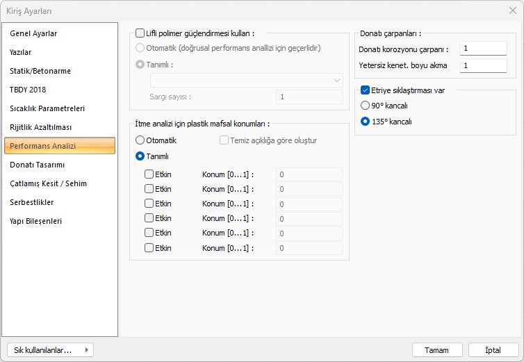 Donatı korozyonu çarpanı ![]() Yapı performans analizinde kullanılan bir orandır. Bu satıra yazılan oranla, deprem yönetmeliğinde belirtilen korozyon şartlarına maruz kalmış mevcut yapılarda, donatılarda oluşan yıpranma, yapının performans hesabında dikkate alınabilir. Bu satırda tanımlanan değer, elemanları mevcut donatı alanlarıyla çarpılır ve çarpım sonucunda bulunan değer donatı alanı olarak dikkate alınır. YeniAlan=çarpan*MevcutAlan |