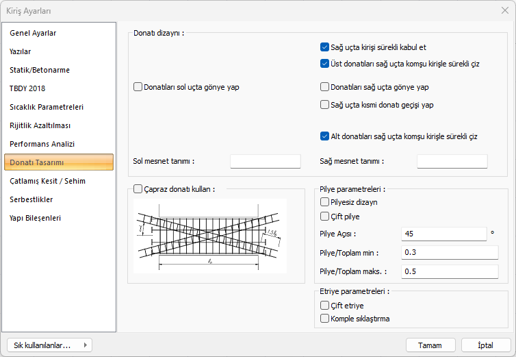 Çapraz donatı kullan ![]() Rijit perdeler arasında kalan bağ kirişlerinin donatılandırılmasına yönelik seçenektir. Seçenek işaretlendiğinde TBDY 2018 Madde 7.6.8.2'de verilen donatılandırma şekli uygulanır. |