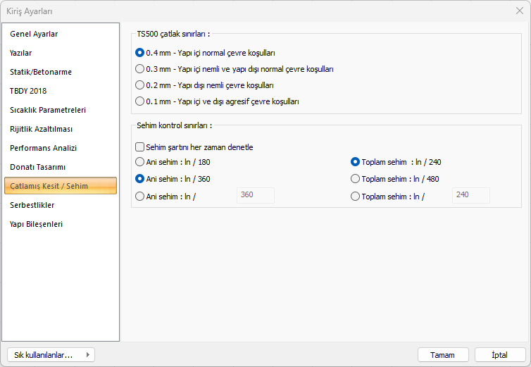 TS500 çatlak sınırları ![]() Kiriş elemanlarının çatlak kontrolü için hangi üst sınırın dikkate alınacağı ilgili seçenek işaretlenerek belirlenir. Üst sınır değerleri TS500’de belirtilen değerlerdir. |