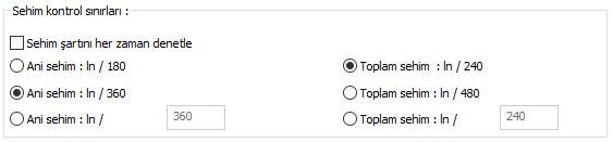 Sehim kontrol sınırları ![]() Sehim kontrolü üst sınır değerleri bu seçeneklerden belirlenir. Sabit değerler TS500'den alınmıştır ayrıca bunların dışında kendinizde sınır değer belirleyebilirsiniz. "Sehim denetle" seçeneği işaretlenirse, "sehim şartı sehim denetimi gerektirmeyen yükseklik koşulu sağlansa" da kirişlerde ani ve zamana bağlı sehim denetimi yapılır. |