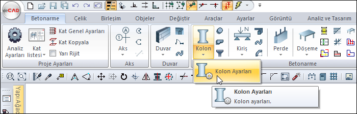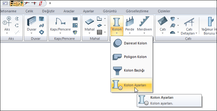 Kolon Ayarları komutuyla boyut, çizim, yerleşim, materyal seçimi, statik malzeme gibi ayarlarına ulaşılır.