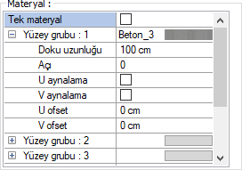 Materyal ![]() Kolonun yüzeylerinde kullanılacak materyal listeden seçilir. Yüzeyler seçilen materyal ile kaplanır ve renderlarda bu şekilde görüntülenir. Gerçek doku uzunluğuna doku uzunluğu girilir. Örneğin; 1 girilirse seçilen materyal dokusu genişliği 1 metre olarak alınır ve ilgili duvarlar üzerine kaplanır. Açııya, dokunun açısı girilir. U ve V öteleme ile dokunun x ve y düzlemindeki hareket değeri girilir. U ve V aynalama ile dokunun y ve x düzlemine göre simetrisi alınır. Tek materyal seçeneği işaretlenerek, kolonun tüm yüzeylerinde, “Yüzey Grubu 1” ‘de seçilen materyal kullanılır. |