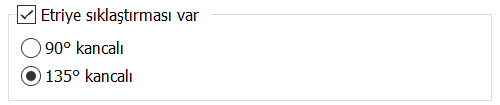 Etriye sıklaştırması var ![]() Mevcut yapıya ait kolonun alt ve üst ucunda etriye sıklaştırması varsa bu seçenek işaretlenir. Bu seçenek işaretlendiğinde kolonlarda sargılı beton davranışı olduğu kabulü yapılır. Mevcut kolonun sıklaştırma bölgesindeki etriyelerin kanca açısının tanımlanması için 90˚ veya 135˚ kancalı seçeneklerinden biri işaretlenmelidir. |