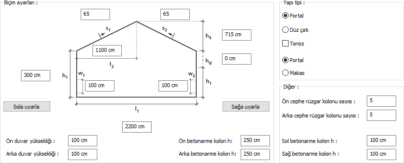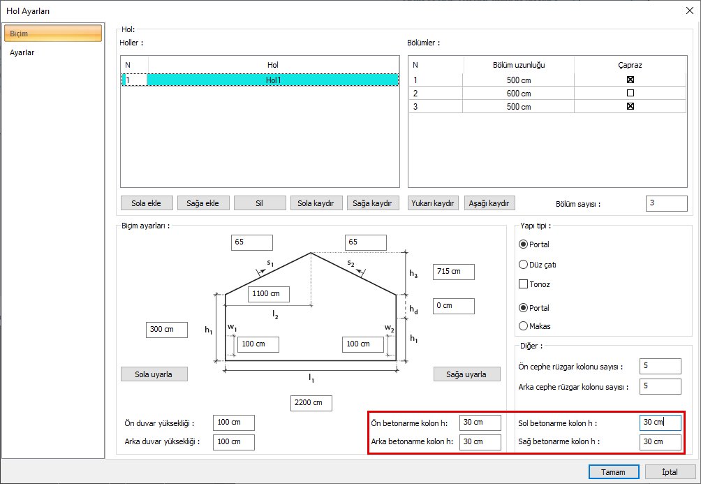 Betonarme kolon yüksekliği ayarları ile hol ayarları diyaloğunda seçilen hole ait betonarme kolon yükseklikleri değiştirilir. Biçim bölümünde ön ve arka, diğer bölümünde sol ve sağ cephe için betonarme kolon yükseklik ayarları bulunur.