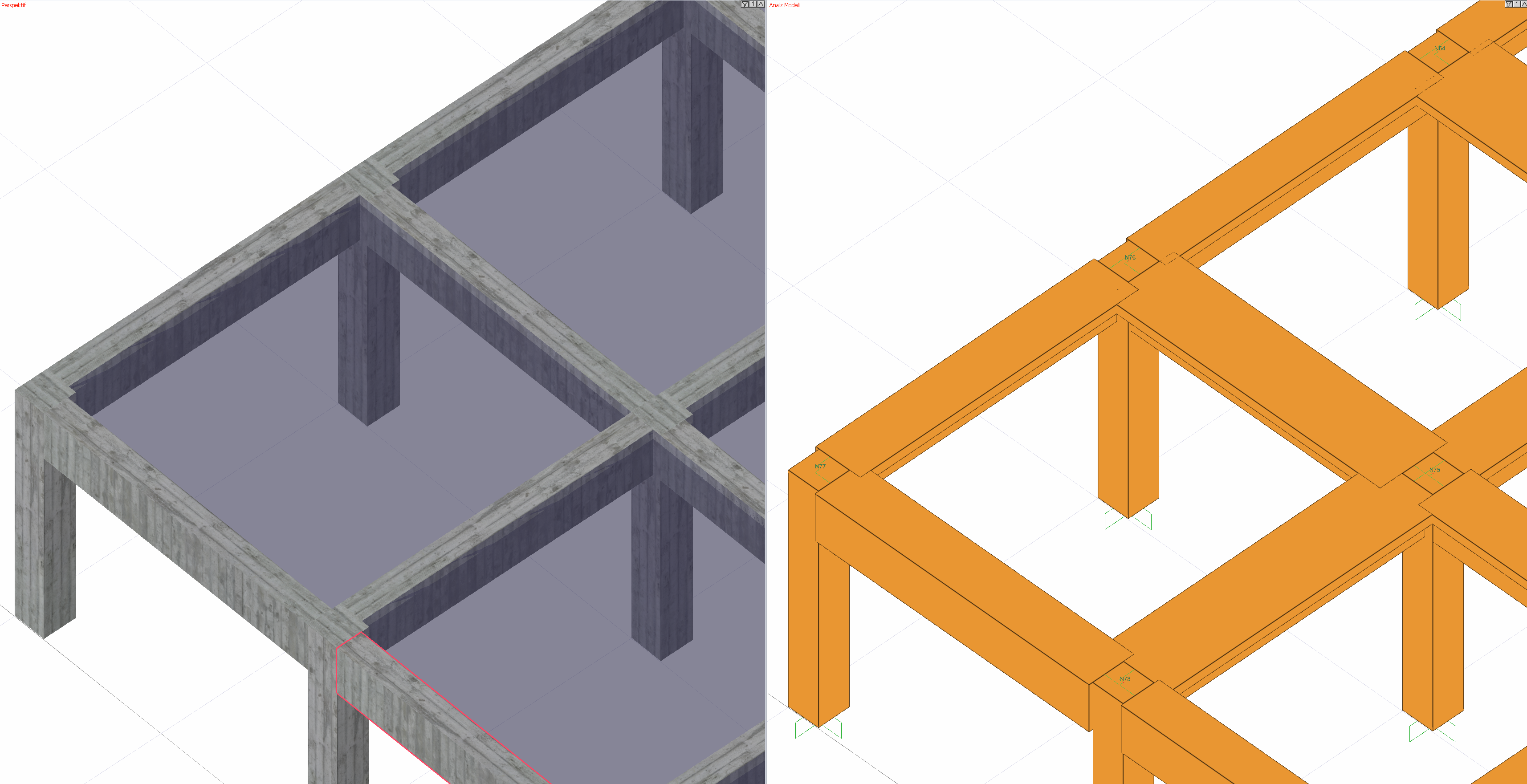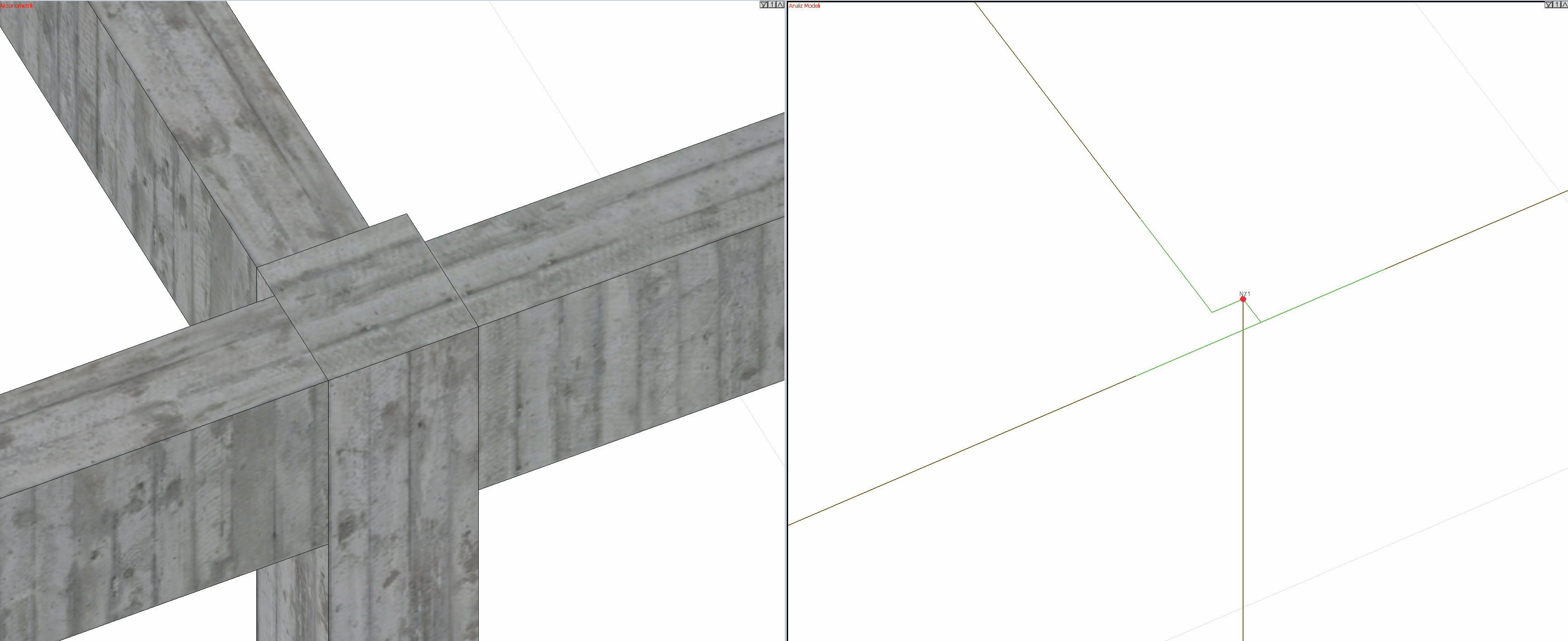 Tam rijit diyafram çözümü için kurulan analiz modelinde kolonlar, tanımlandığı boyutların rijitlikleri ile analiz sistemine dahil olur. Döşemeler ile bağlanan kirişlerin analiz modeli kurulurken tablalı kesit kabulü yapılmaktadır. Aşağıdaki resimde dolu gövdeli sistem olarak gösterilen analiz modelinde kirişlerin uygun tabla boyutları hesaplanarak analiz modeline dahil edildiği gözlemlenebilir.