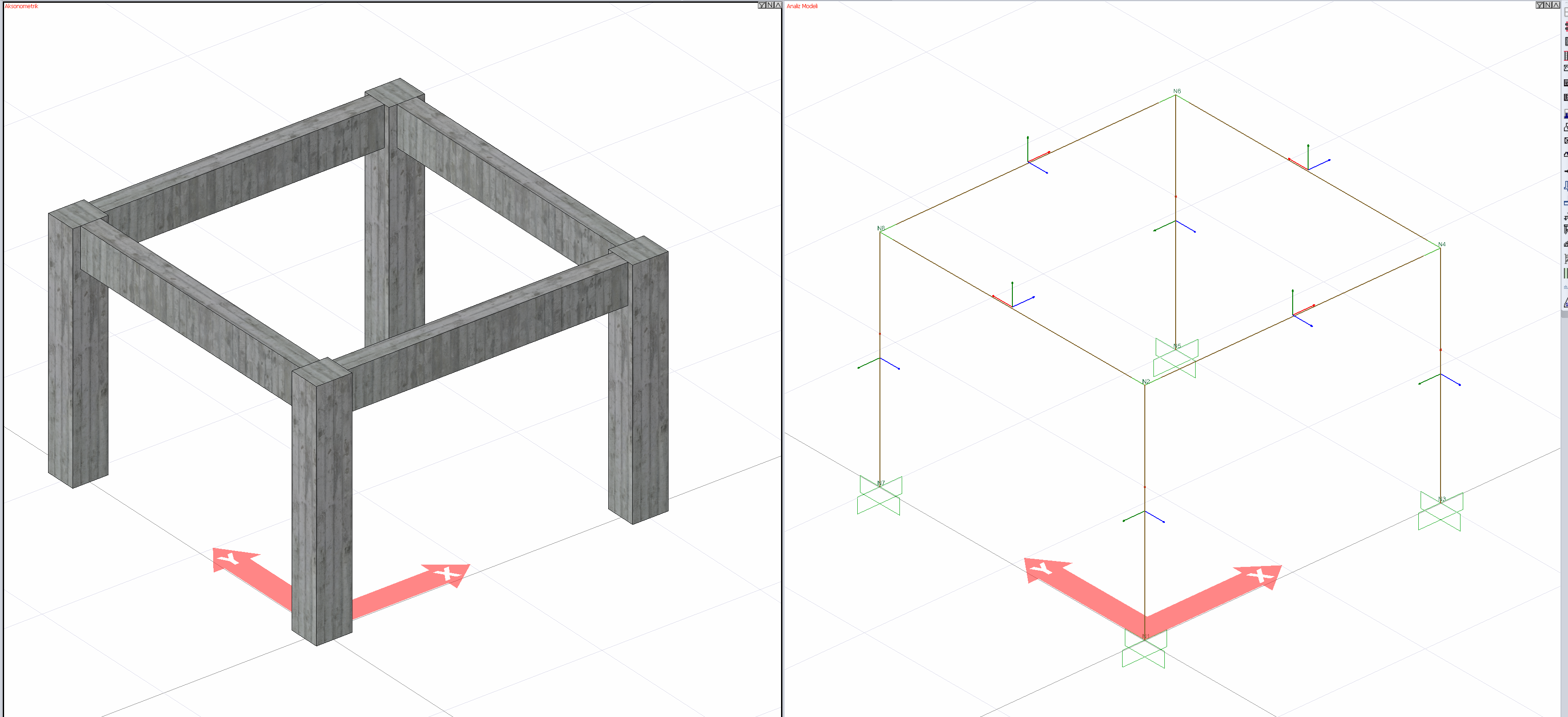 Çubuk sonlu elemanların (kolonlar ve kirişler) analiz sonucu bulunan iç kuvvetleri yerel çubuk ekseni (lokal aks) yön kabulüne göre gösterilmektedir. 3 boyutlu analiz yapılan bir çubuk elemanda 3 adet lokal aks bulunur. Bu lokal akslar çubuğun konumuna ve yerleşimine göre değişiklik gösterebilir. Çubuk elemanlarda lokal aksların örnek bir görüntüsü aşağıdaki resimde gösterilmiştir.