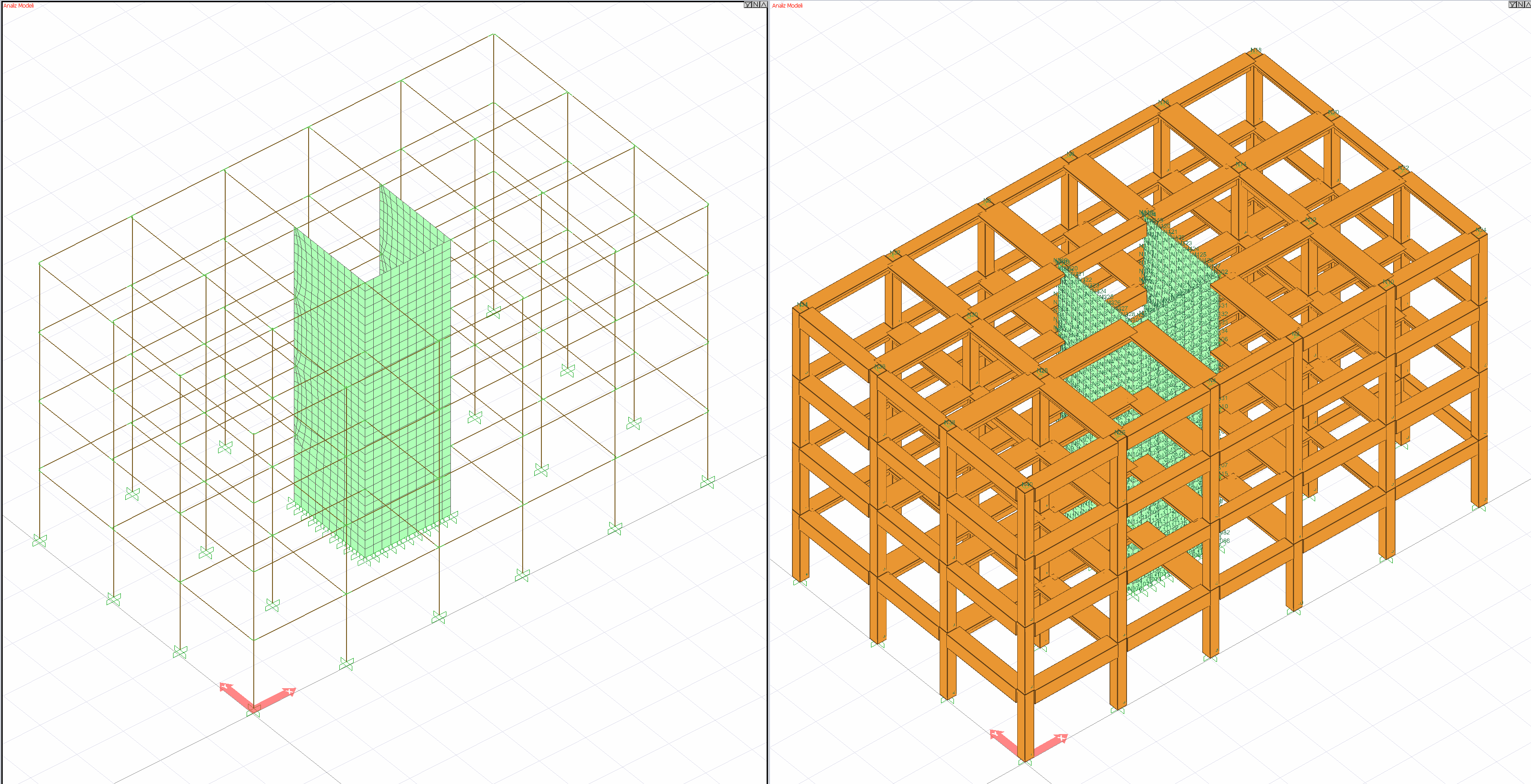 Kabuk sonlu elemanlar ile modellenmiş döşeme ve perdeler içeren bir yapının analiz sonuçları aşağıdaki gibi görülebilir.