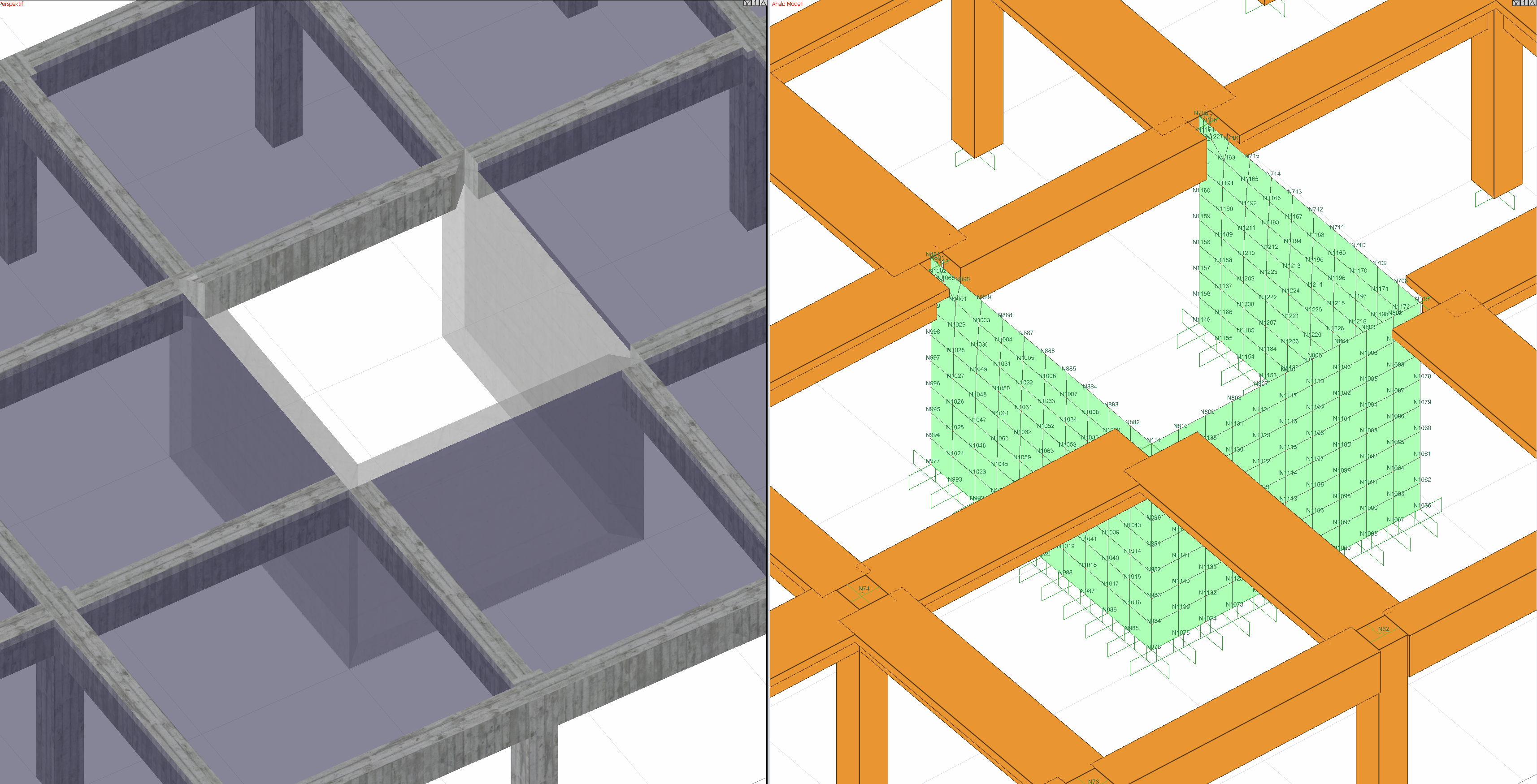 Perde ve kirişler, uygun link elemanları ile bağlanarak analiz modeli otomatik oluşturulur.