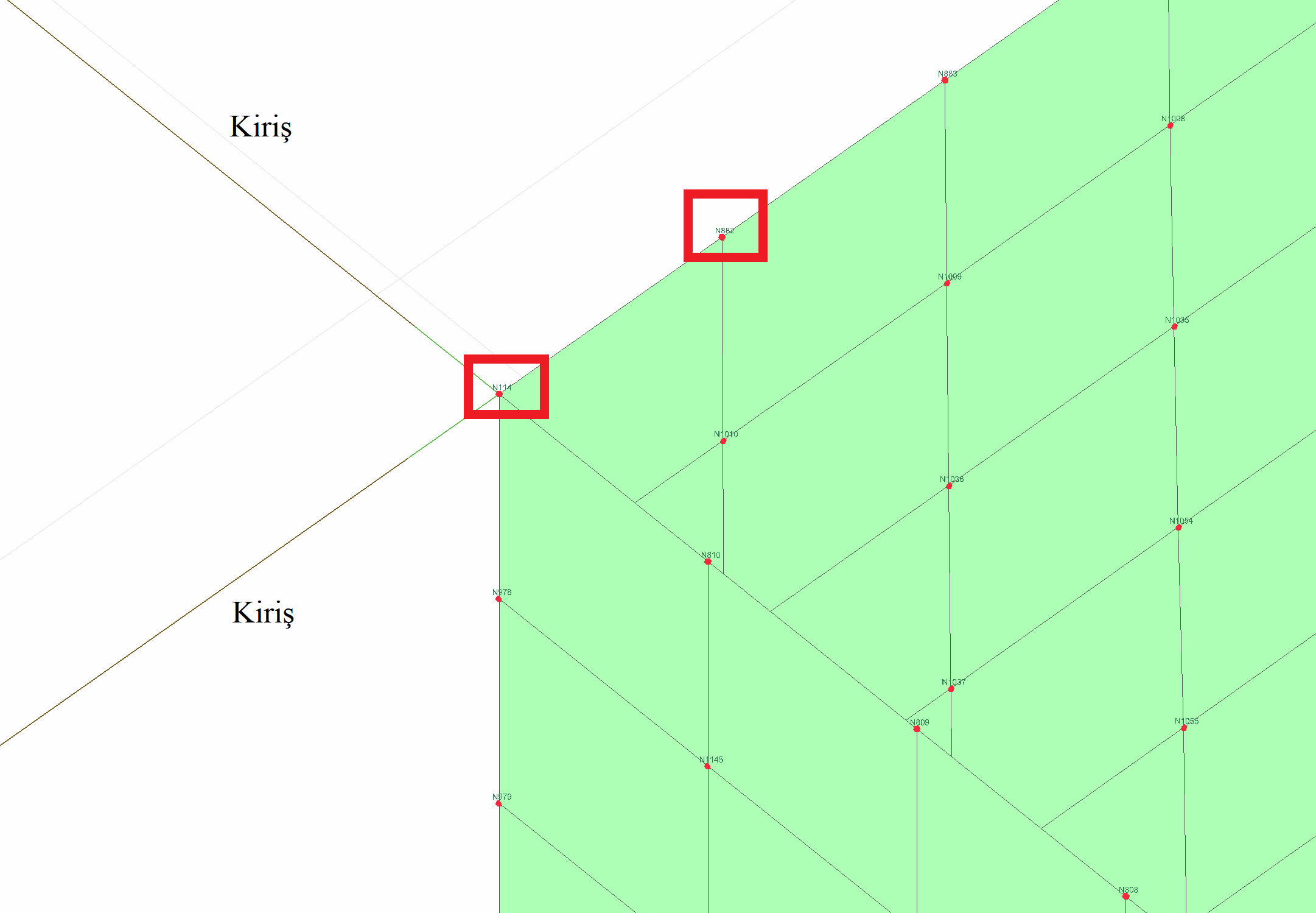 Perde kiriş bağlantısının analiz modeli oluşturulurken, kiriş elemanını temsil eden çubuk sonlu eleman, perdeyi temsil eden kabul sonlu elemanlarının birden fazla düğüm noktasına bağlanması ile kiriş-perde arasındaki gerçek davranışı simgelenir. Aşağıdaki resimde kiriş-perde bağlantısının analiz modelinde link elemanı ile bağlanan düğüm noktaları kırmızı ile işaretlenerek gösterilmiştir.