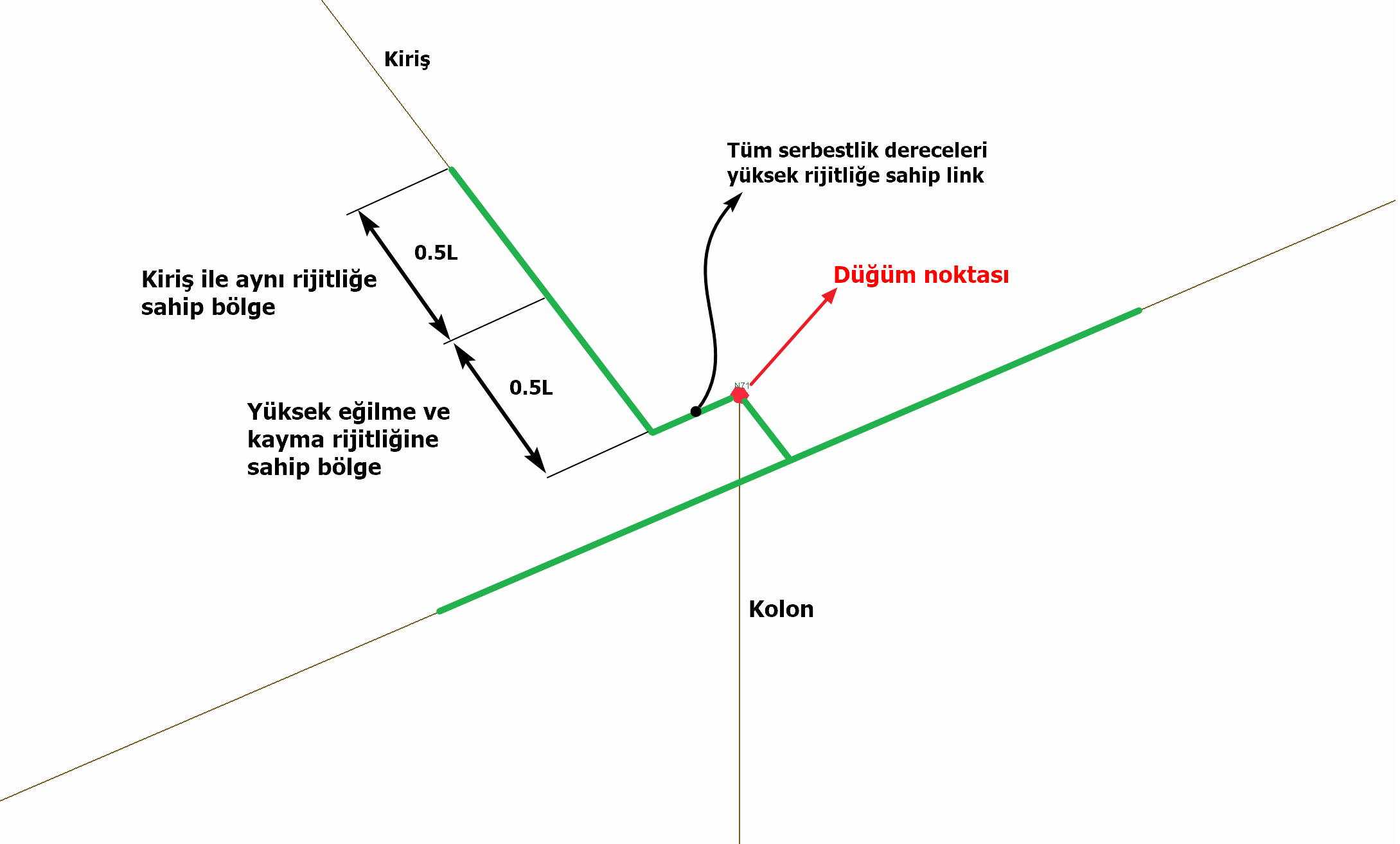 Betonarme kiriş ekseninde tanımlanan yeşil link elemanında, kirişin devamındaki link uzunluğunun yarısı, kiriş ile aynı rijitlik değerlerine, uzunluğun kalan yarısı çok yüksek eğilme ve kayma rijitliğine sahiptir. Yüksek rijitliğe sahip olan bölümde, kirişin lokal eksenine göre 3 yönündeki moment ve 2 yönündeki kesme rijitlikleri yüksek değere sahiptir. Kaçıklık olması durumunda bütün yönlerdeki rijitlikler yüksek (sonsuz) değerde tanımlanır. Aşağıdaki resimde bu durum gösterilmiştir. L uzunluğu link elemanının uzunluğu olarak tanımlanmıştır.