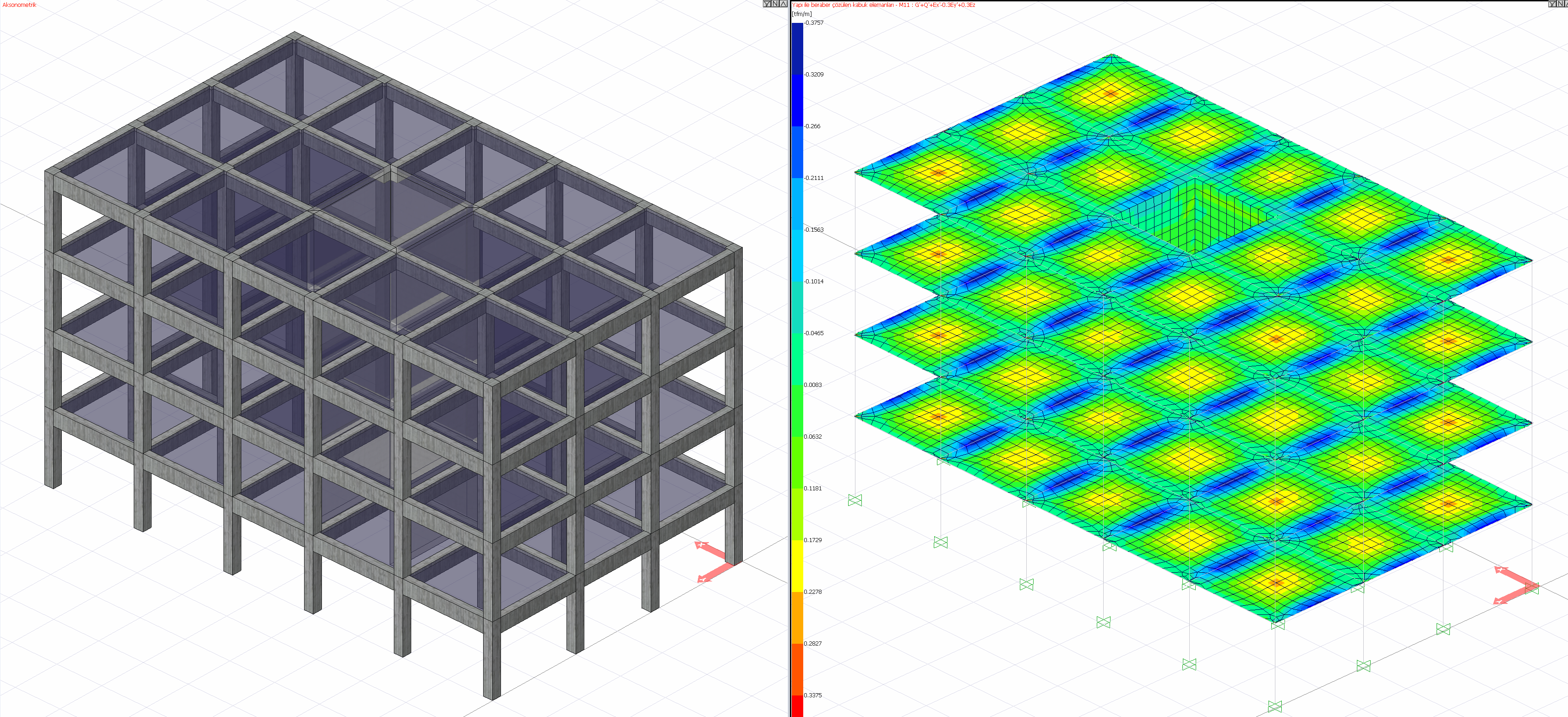 Kabuk sonlu elemanlar ile modellenmiş döşeme ve perdeler içeren bir yapının analiz sonuçları aşağıdaki gibi görülebilir.