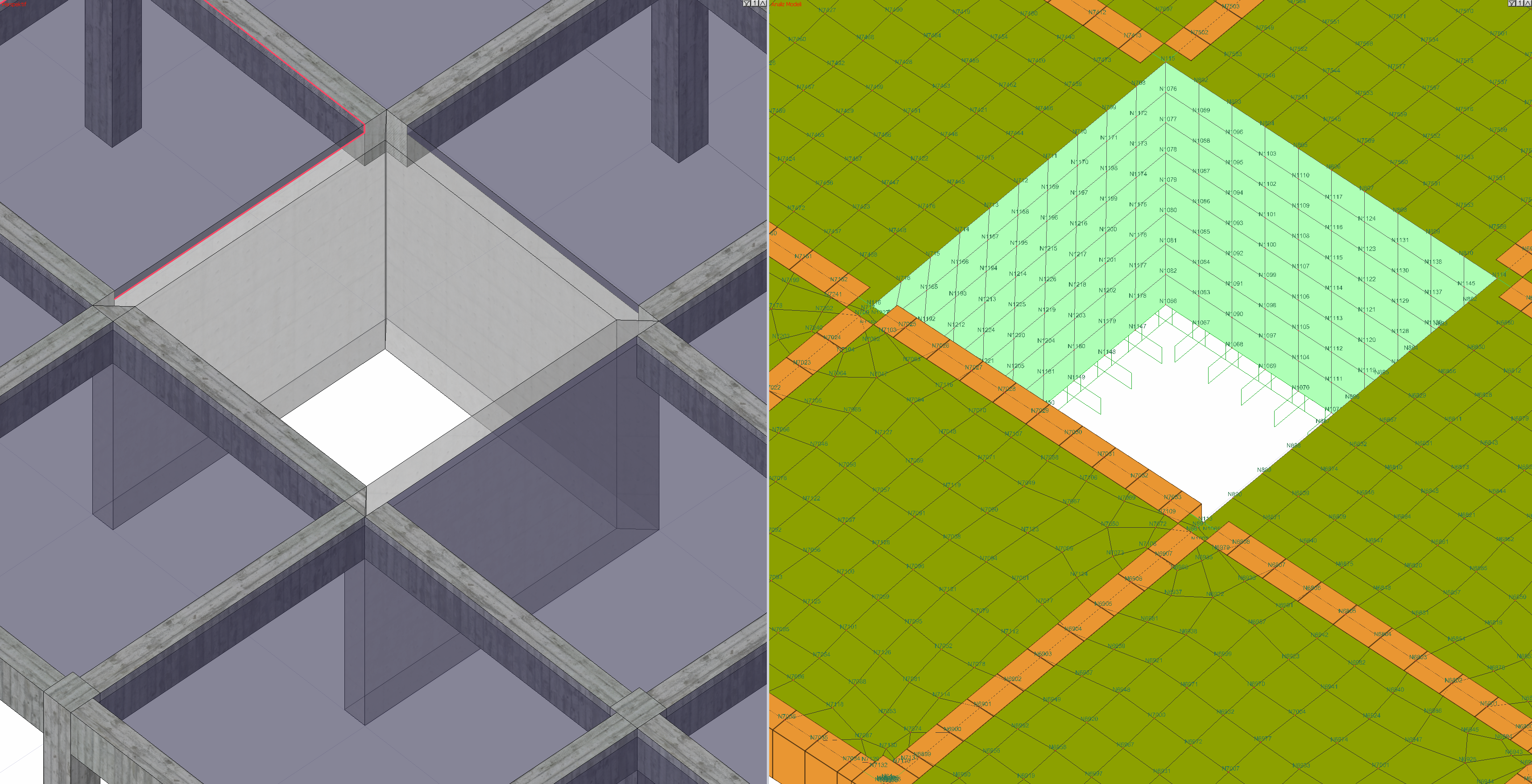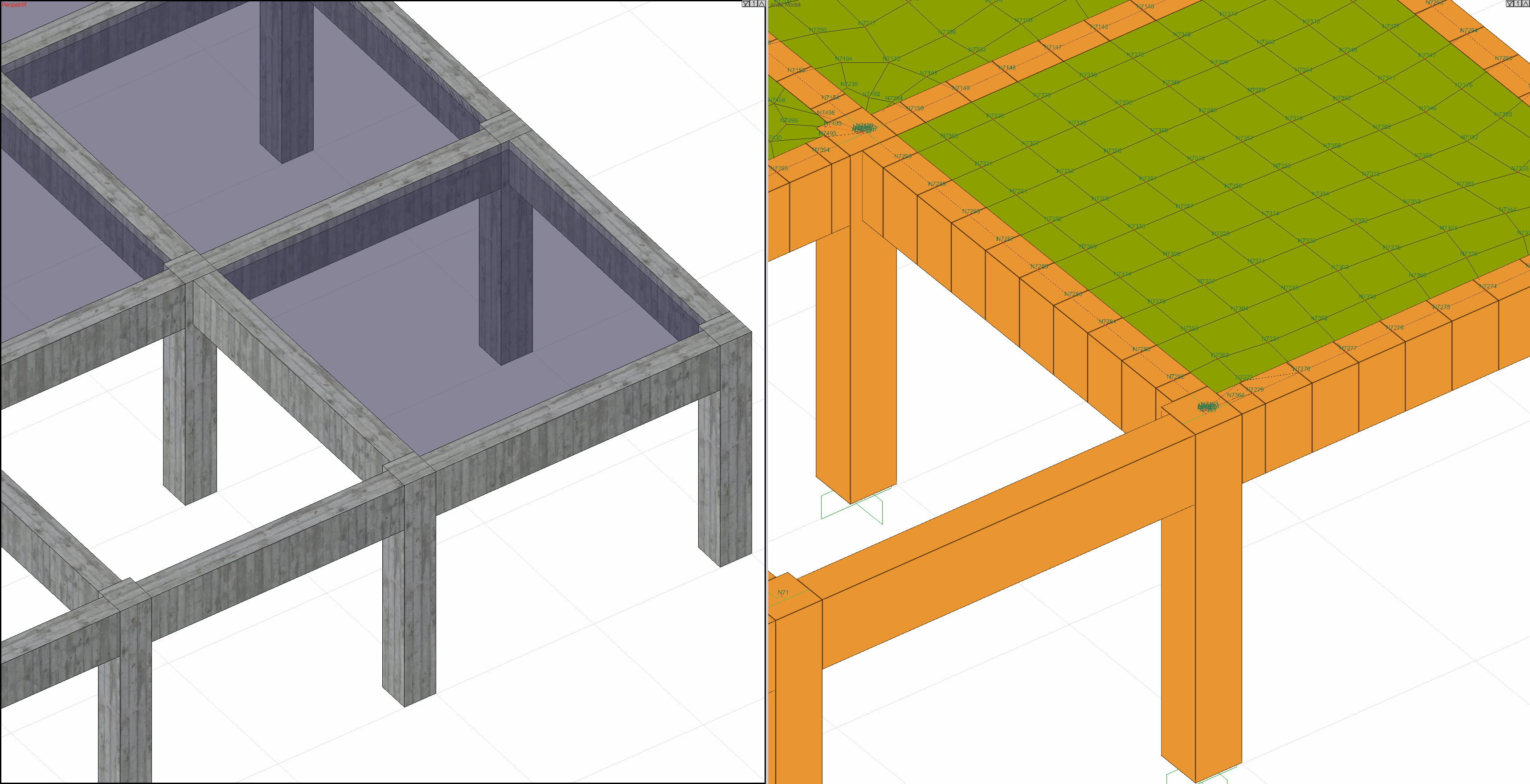 Döşeme, kiriş, kolon, perde betonarme elemanlarının analiz modeli oluşturulurken, çubuk ve kabuk sonlu elemanların düğüm noktaları otomatik şekilde bağlanır.