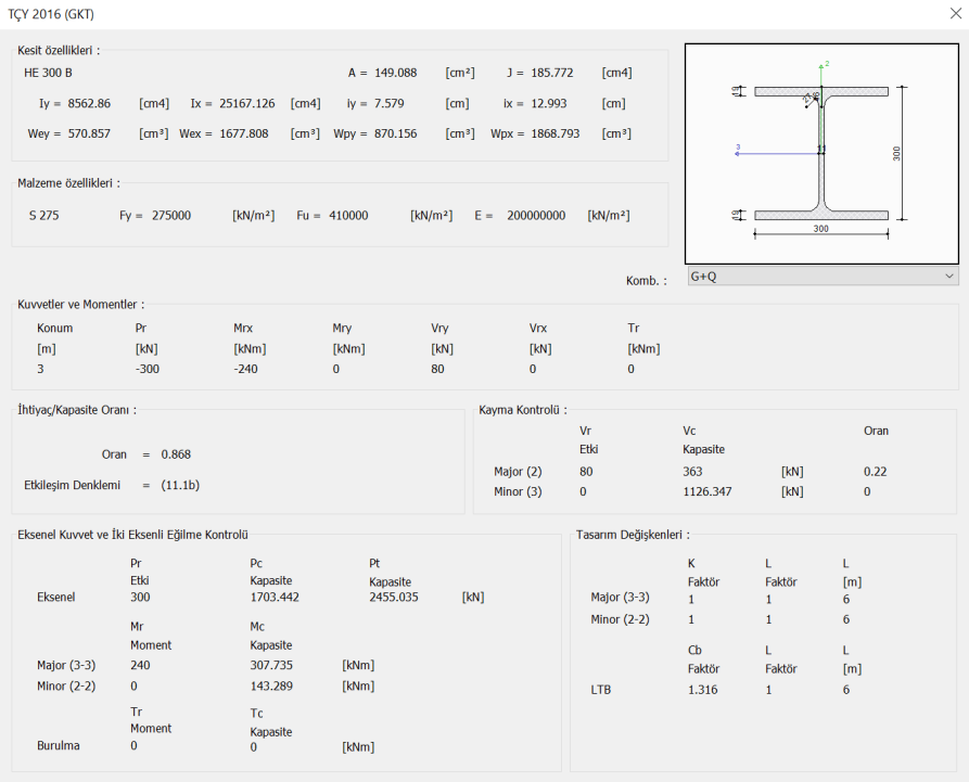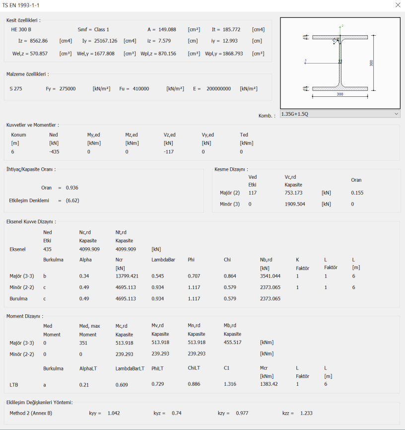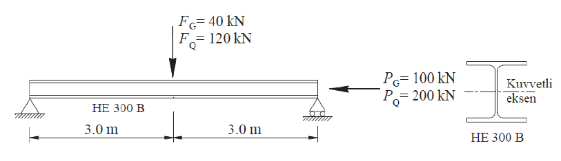 Aşağıdaki şekilde verilen sistemde yükleme durumu verilen HE 300 B enkesitli kolon elemanın sabit ve hareketli yükleri verilmiştir. Sistemin birleşik etkiler altında elemanının tasarımını GKT ve YDKT dayanım kontrollerini kullanarak tasarım kuvvetlerini bulunuz.