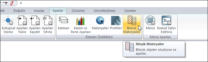 Bileşik materyaller sıva, duvar çekirdeği, düzeltme betonu, yalıtım gibi farklı katmanların bir grupta toplanmasıdır. Bir obje üzerinde uygulamada olacak bütün katmanlar ideCAD’de kullanıcı tarafından bileşik materyal olarak tanımlanır. Bileşik materyallerin çizim tekniği, tarama tipi ve renk ayarlarıyla belirlenir. Tanımlanan bileşik materyal obje ayarları diyaloğundan objeye atanır.