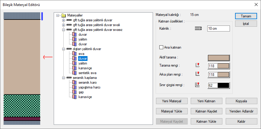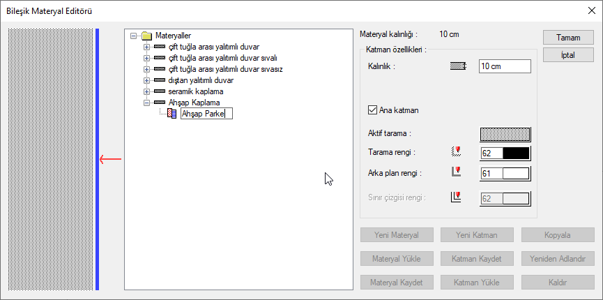 Materyal kalınlığı ![]() Tanımlanan bileşik materyalin hangi kalınlıkta oluşturulduğu bilgisi yazar. |