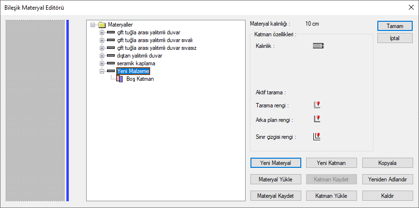 Bileşik materyaller listesinde Yeni Materyal isimli bir satır oluşacaktır. Yeni Materyal ismi bu aşamada değiştirebilir.