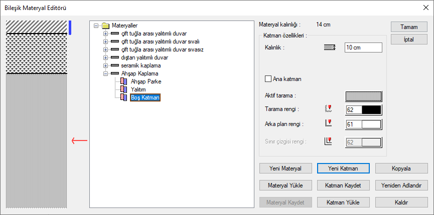 Katman oluşturdukça sol tarafta materyallerin görünümü değişecektir. Her katman, bileşik materyalin tabakasını temsil etmektedir. Sağ taraftaki parametreleri kullanarak katmanın kalınlığını, rengini, tarama tipini değiştirebilirsiniz.
