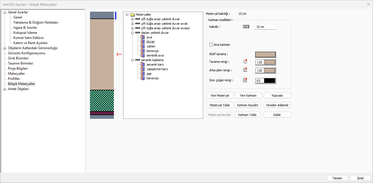 Bileşik materyaller sıva, duvar çekirdeği, düzeltme betonu, yalıtım gibi farklı katmanların bir grupta toplanmasıdır. Bir obje üzerinde uygulamada olacak bütün katmanlar ideCAD’de kullanıcı tarafından bileşik materyal olarak tanımlanır. Bileşik materyallerin çizim tekniği, tarama tipi ve renk ayarlarıyla belirlenir.