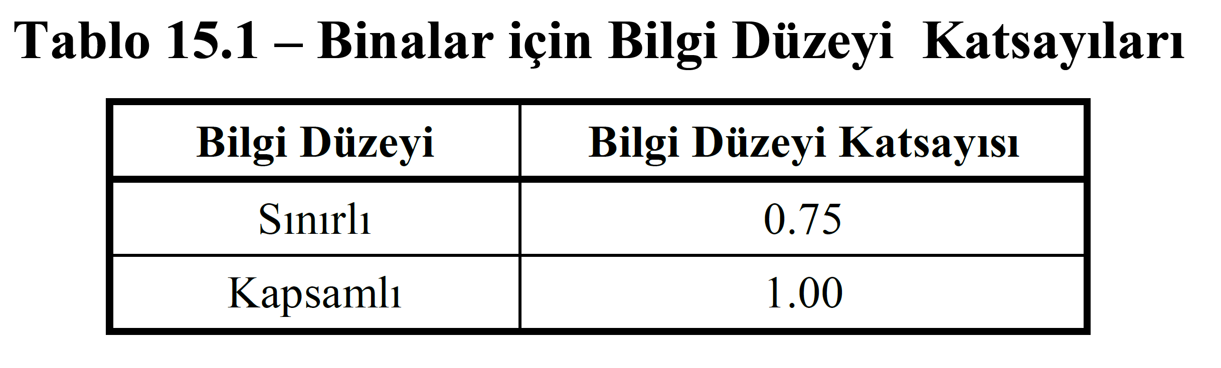 Binaların incelenmesinden elde edilecek mevcut durum bilgilerinin kapsamına göre, her bina türü için bilgi düzeyi ve buna bağlı olarak 15.2.12 ’de belirtilen bilgi düzeyi katsayıları tanımlanacaktır. Bilgi düzeyleri sırasıyla sınırlı ve kapsamlı olarak sınıflandırılacaktır. Elde edilen bilgi düzeyleri taşıyıcı eleman kapasitelerinin hesaplanmasında kullanılacaktır.