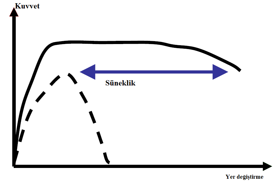 Deprem etkisi altında yapı elemanları yukarıdaki eğriye benzer davranış gösterir. Yapıyı sünek tasarlayabilmek için elemanların yapabildiği bu yer değiştirme kabiliyeti kullanılır.Örneğin aşağıdaki şekilde kesikli çizgi ile gösterilen davranış gevrek tasarlanan bir binayı, sürekli çizgi ise sünek binayı simgeler.