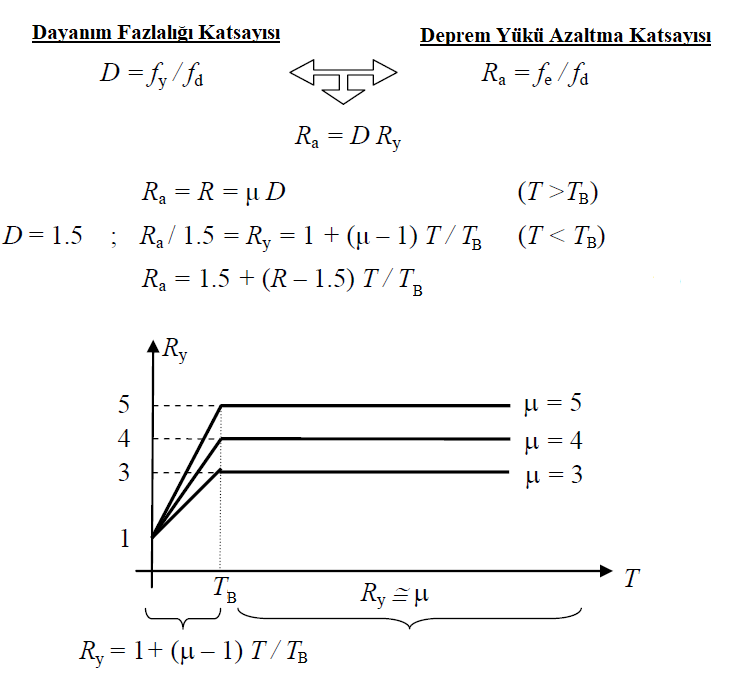 Dayanıma Göre Tasarım’da taşıma gücü yaklaşımı ile kesit tasarımı için, her bir taşıyıcı sistem türü için seçilen belirli sabit bir süneklik kapasitesine karşı gelen Deprem Yükü Azaltma Katsayısı Ra (T) Aşağıdaki şekilde tanımlanır;
