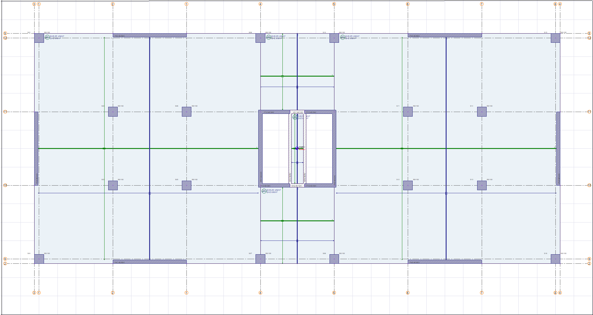 - Bina X doğrultusunda 8’er m açıklığa sahip 8 adet akstan, Y doğrultusunda ise 8’er m açıklığa sahip 4 akstan oluşmaktadır.