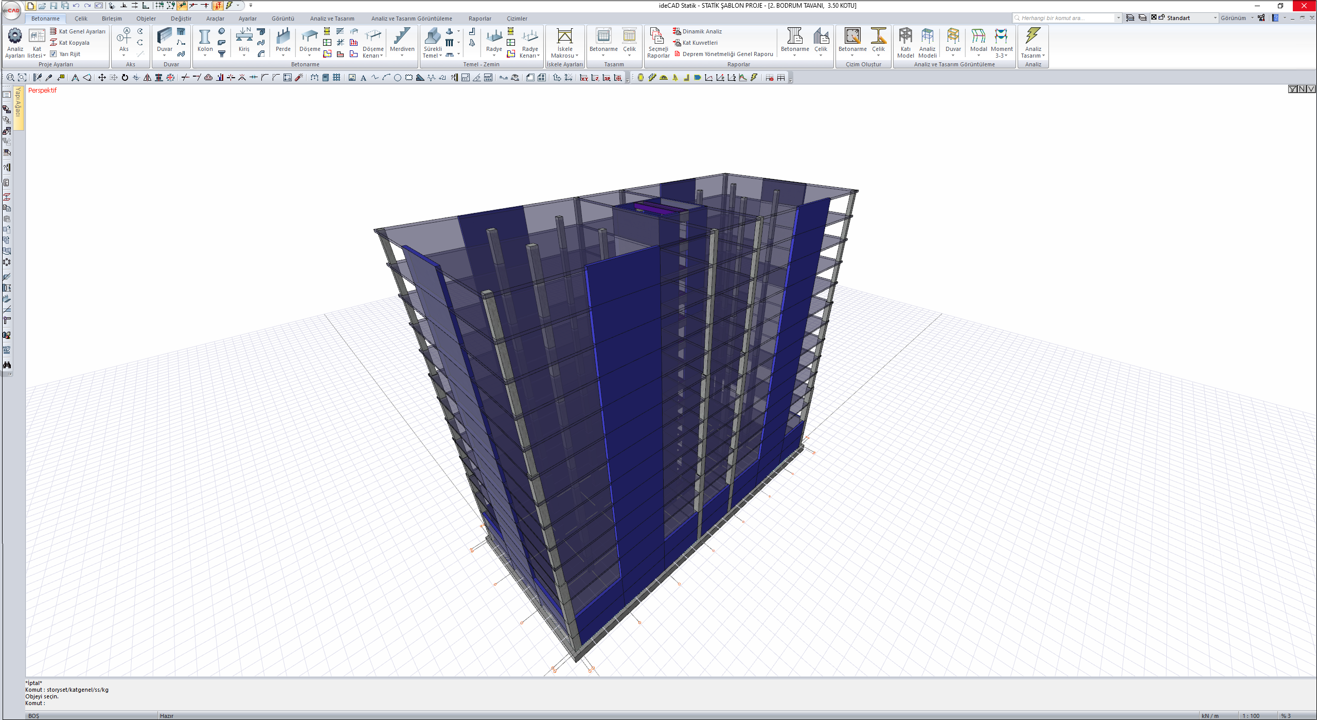 - Yapının taşıyıcı sisteminin süneklik düzeyi yüksek perdeler ile kirişsiz döşemelerden oluşturulması öngörülmüştür. Binanın orta bölgesinde iki adet U şeklinde perde grubu bağ kirişleri ile bağlanarak çekirdek perde oluşturulmuştur. Döşeme ile kolon ve perde bağlantılarında herhangi bir kolon başlığı veya tabla oluşturulmamıştır.