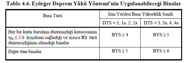 TBDY 2018 Tablo 4.4’de Doğrusal Hesap Yöntemleri arasından Eşdeğer Deprem Yükü Yöntemi'nin uygulanabileceği binalar ile ilgili şartlar mevcuttur.