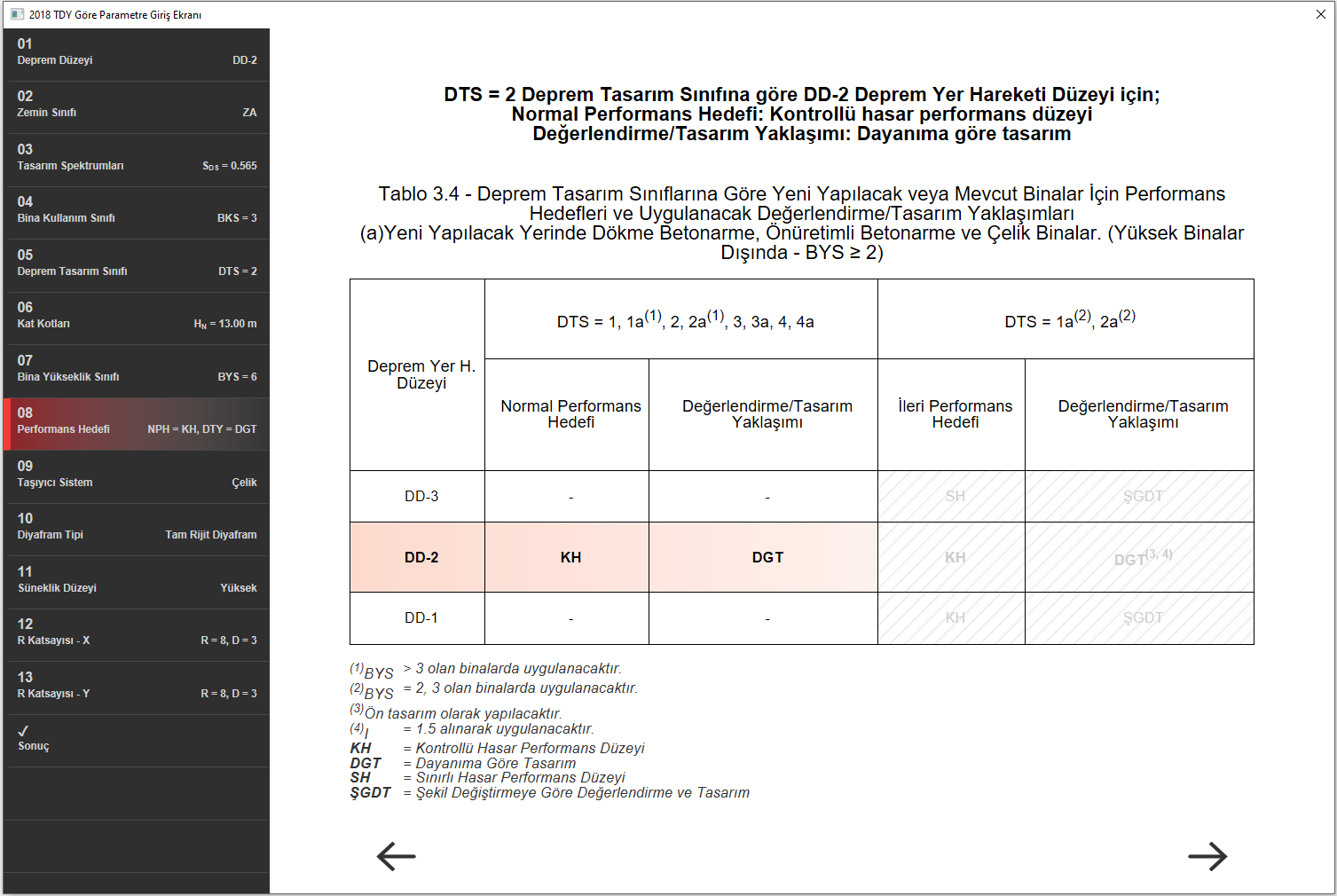 TBDY 2018 Tablo 3.4’e göre DD-2 deprem yer hareketi düzeyi için yeni yapılacak çelik binaların Kontrollü Hasar Performans Hedefi için Dayanıma Göre Tasarım yaklaşımı ile çözümü gerekir.