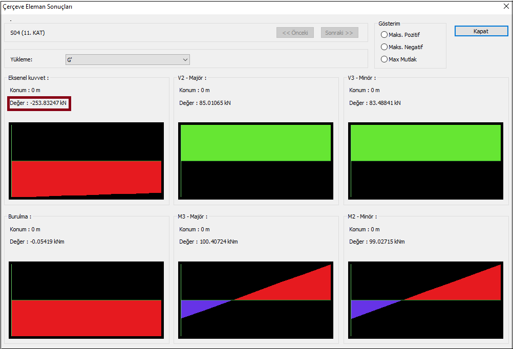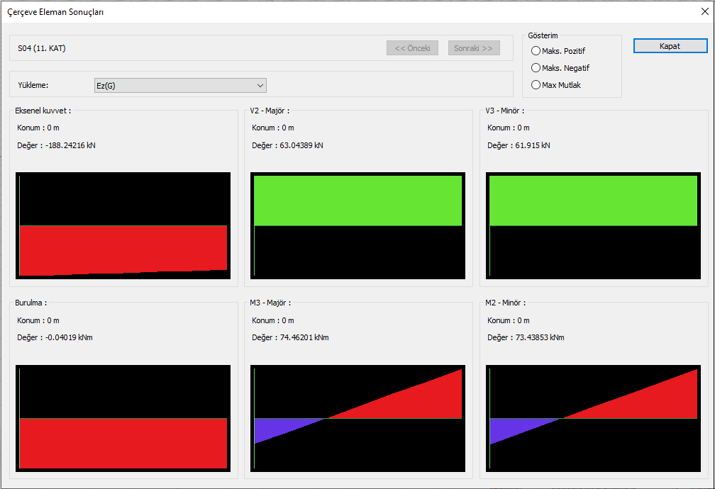 Elle kontrolü gerçekleştirmek için arayüzde kesit tesirleri incelenirken G' yüklemesi ile Ed(Z) yüklemesi arasındaki oranın (2/3)SDS’e eşit olup olmadığı kontrol edilir. Aynı işlem eleman raporlarında tasarıma esas iç kuvvetler sayfasından da gerçekleştirilebilinir. Örneğin; aşağıda görselleri yer alan ilgili kolon için bu oran şu şekilde hesaplanır: