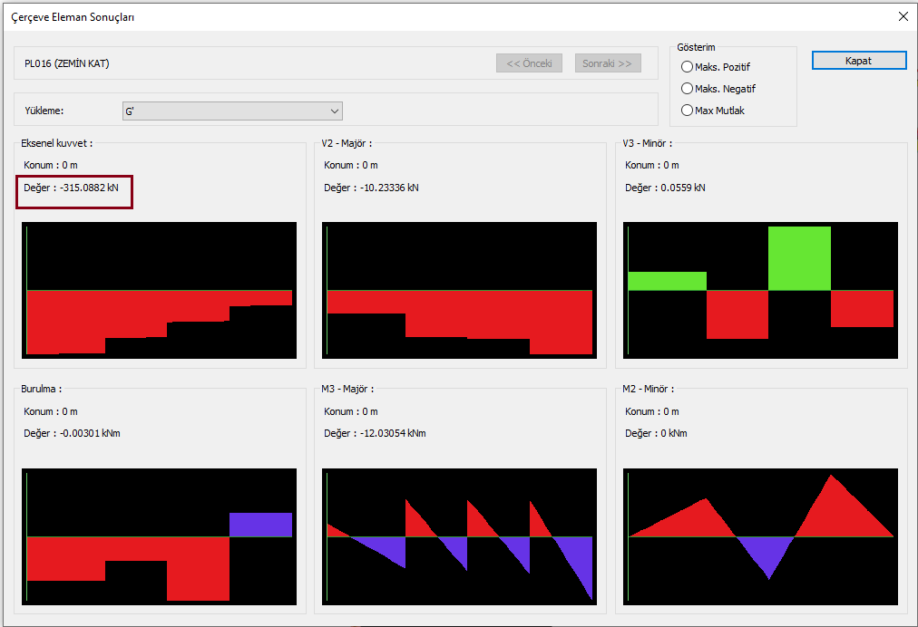 Elle kontrolü gerçekleştirmek için arayüzde kesit tesirleri incelenirken G yüklemesi ile Ed(Z) yüklemesi arasındaki oranın (2/3)SDS’e eşit olup olmadığı kontrol edilir. Örneğin; aşağıda görselleri yer alan ilgili kolon için bu oran şu şekilde hesaplanır: