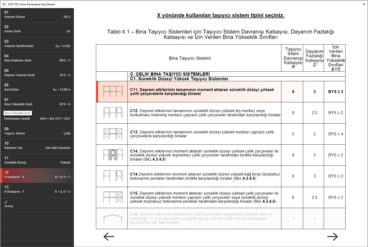 TBDY Tablo 4.1’e göre izin verilen bina yükseklik sınıfına uygun olarak BYS=6 ≥ 3, deprem etkilerinin tamamının moment aktaran süneklik düzeyi yüksek çelik çerçevelerle karşılandığı binalar için taşıyıcı sistem davranış katsayısı, R=8 ve dayanım fazlalığı katsayısı, D=3 olarak verilmektedir.