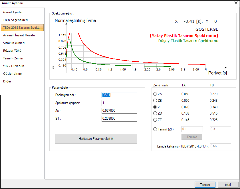 Geoteknik raporda belirtilen ZC yerel zemin sınıfına göre TBDY 2018 Tablo 2.1’den yerel zemin etki katsayıları elde edilir ve Tasarım spektral ivme katsayıları ideCAD tarafından otomatik hesaplanır.