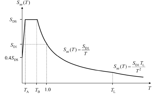Koordinatlara bağlı olarak AFAD’dan elde edilen spektral ivme katsayıları ile aşağıdaki formüle göre yatay elastik tasarım spektrumu Sae(T) hesaplanır. Yatay elastik tasarım spektrumu için her bölgede farklı olmak üzere toplamda 4 fonksiyon ile temsil edilir ve aşağıdaki grafik ile gösterilir.