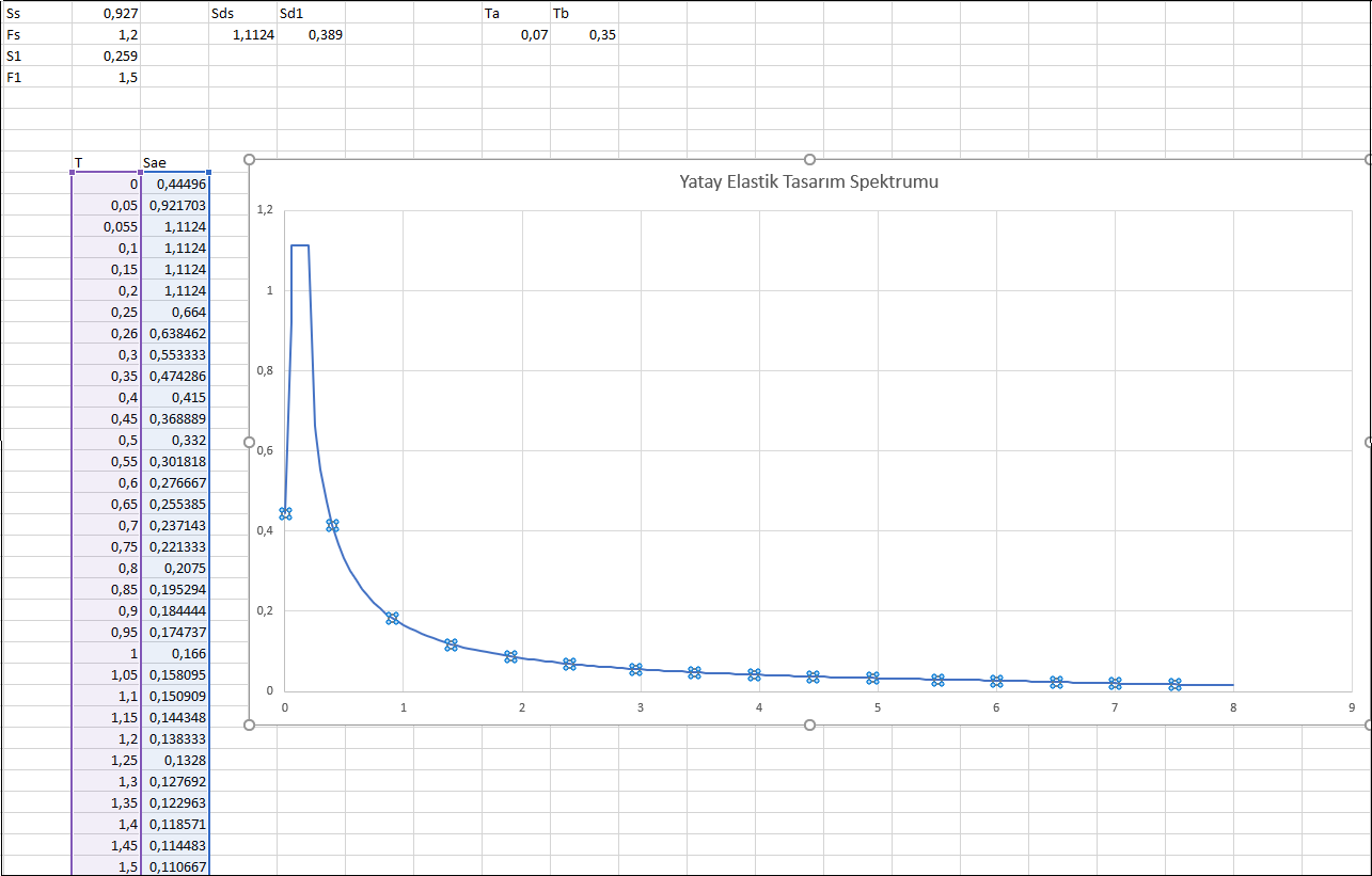 Spektrumu oluşturmak için zaman olarak 0 saniyeden başlayarak uygun aralıklar ile zaman arttırılmalı ve TL=6 s’den sonra uygun bir T değerinde durdurulmalıdır. Bu bina için T=0 s’den başlanarak 0.05 aralık ile T=8 s’ye kadar yatay elastik spektrum excel yardımı ile hesaplanmıştır. Elde edilen spektrum aşağıda görselde verilmektedir.