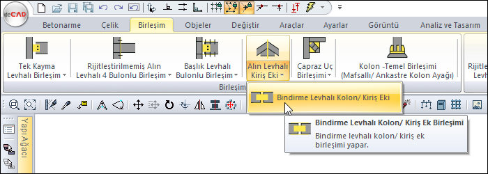 Çelik menüsünden Bindirme Levhalı Kolon/Kiriş Ek Birleşimi satırını tıklayın.